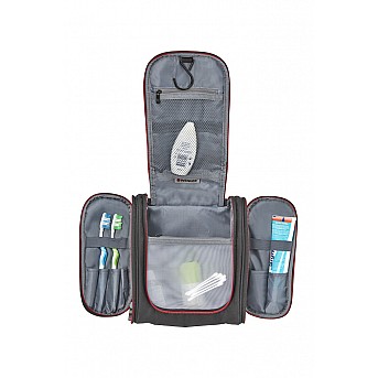 Сбор вещей для поездки не должен быть рутиной. Просто убедитесь у вас есть подвесная сумка для компактного хранения вещей, аксессуаров и туалетных принадлежностей. У нее есть эластичные кольца для крепления бутылочек с лосьоном или гелем для душа, а также молния с подкладкой для другой косметики и косметических средств. Благодаря крючку сзади и прочному водонепроницаемому полиэстеру, вы можете держать эту сумку под рукой даже в ванной. Основные преимущества Подвесной крючок и прочный водостойкий полиэстер для удобного и эффективного хранения в ванной комнате С эластичными петлями для бутылочек с лосьоном или гелем для душа Карман на молнии для косметики и туалетных принадлежностей